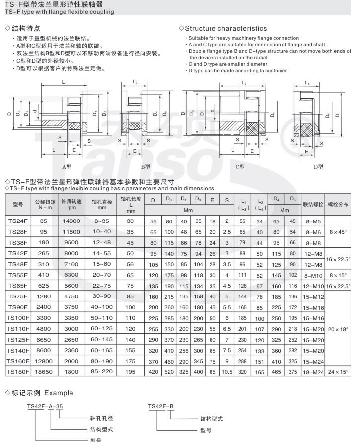 星形彈性聯(lián)軸器是利用星形彈性元件置于兩半聯(lián)軸器凸爪之間以實(shí)現(xiàn)現(xiàn)半聯(lián)軸器的彈性聯(lián)接,結(jié)構(gòu)特點(diǎn)尺寸緊湊慣性小,以工程塑料作彈性元件,適用于聯(lián)接兩同軸線的傳動(dòng)軸系,具有補(bǔ)償兩軸相對(duì)偏移、緩沖、減震、耐磨性能,不用潤(rùn)滑,可以在有粉塵和水份的條件下工作,結(jié)構(gòu)簡(jiǎn)單,維修方便,但更換彈性元件時(shí)需移動(dòng)一端半聯(lián)軸器和主機(jī)軸。適應(yīng)場(chǎng)合普遍,傳遞轉(zhuǎn)矩20-35000.N.M,工作溫度-35-+80攝氏度并與德國(guó)ROTEX聯(lián)軸器互換。聚氨脂彈性體由凸形爪塊限制,可避免由于沖擊產(chǎn)生的內(nèi)部變形及離心力產(chǎn)生的外部變形;凸爪大的凹面,使?jié)u開(kāi)線齒上的表面壓力很小,齒上即使承受過(guò)載,齒仍不會(huì)磨損或變形。具有補(bǔ)償兩軸相對(duì)偏移、減振、緩沖、徑向尺寸小、承載能力較高、維護(hù)方便等特點(diǎn),但更換彈性元件時(shí)兩半聯(lián)軸器需沿軸向移動(dòng)。適用于聯(lián)接兩同軸線、起動(dòng)頻繁、正反轉(zhuǎn)變化、中低速、中小功率傳動(dòng)軸系、要求工作可靠性高的工作部位,不適用于重載及軸向尺寸受限制、更換彈性元件后兩軸線對(duì)中困難的部位。